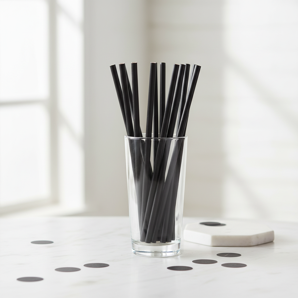 Black paper straws in glass on marble surface - premium matte finish